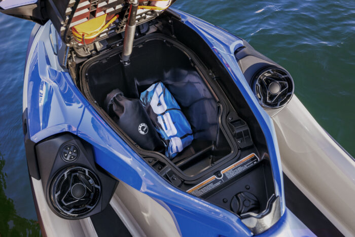 7.8インチのフルカラーディスプレイで表示が見やすく、機能が飛躍的に向上しています。またBluetooth、USB、スマートフォンアプリを統合することで、スムーズに音楽、天気予報、ナビゲーション機能などを使用できます。100Wの防水性のある完全統合型のBRP Bluetoothプレミアムオーディオシステムが乗船体験を仕上げます。